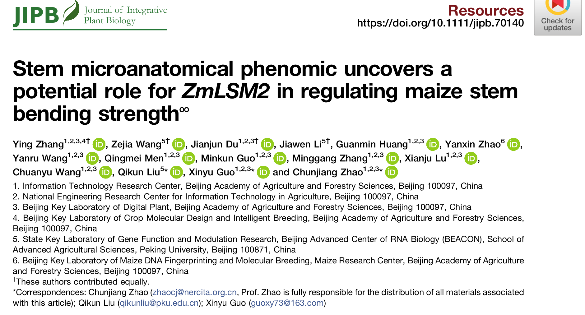 JIPB∣北京市农林科学院信息技术研究中心赵春江院士团队联合北京大学刘启昆团队通过多组学联合分析揭示玉米茎秆力学强度的遗传调控新机制 -