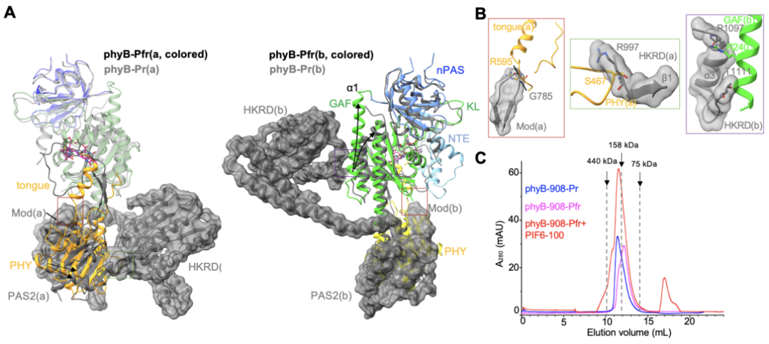 In phyB-Pr, the C-terminal domain PAS2 and HKRD interact with the N-terminal domains GAF and PHY to maintain a "head-to-tail" dimeric conformation. However, in phyB-Pfr, when the tongue-like protrusion of the PHY domain transitions into an α-helix, it directly clashes with the PAS2 domain in phyB-Pr, disrupting the extensive interactions between PAS2 and PHY domains (Figure 3A, left; Figure 3B, left). This further disrupts the intramolecular interactions between HKRD and PHY domains (Figure 3A, left; Figure 3B, middle), as well as between HKRD and GAF domains (Figure 3A, right; Figure 3B, right), completely breaking the "head-to-tail" structure in phyB-Pr and ultimately activating phyB. Additionally, the truncated form of phyB lacking the HKRD domain (phyB-908, consisting of only the N-terminal 908 amino acids) tends to exist as a monomer after light activation (Figure 3C), further supporting that the "head-to-tail" dimer, which was originally maintained by interactions between the N-terminal and C-terminal modules, is disrupted upon light activation, resulting in the formation of phyB-Pfr.