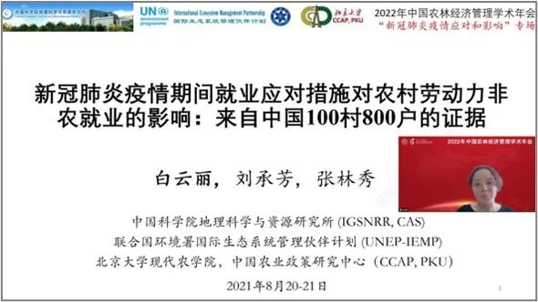 2022年8月20日下午,中国农林经济管理学术年会“应对和影响:基于新冠肺炎疫情前后大数据和一手调查数据的实证研究”专场研讨会成功举办。研讨会邀请北京大学、中国人民大学、北京师范大学、中央民族大学、北京林业大学、中国科学院地理科学与资源研究所、联合国环境署国际生态系统管理伙伴计划(UNEP-IEMP)等单位的专家学者进行研讨和交流。专场由北京大学现代农学院副院长、博雅特聘教授、中国农业政策研究中心副主任刘承芳老师主持,累计有200多位学者线上参会。
