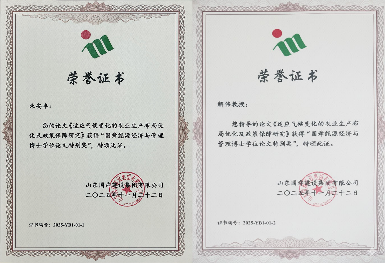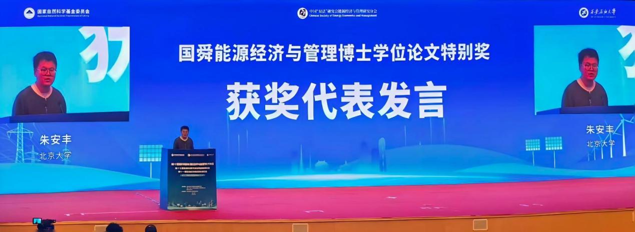 会议期间,颁发了“国舜能源经济与管理优秀博士学位论文”奖,该奖项旨在推动能源经济与管理(含应对气候变化)领域的学术创新,促进高层次青年人才培养,奖励在相关领域取得突出创新成果的博士学位论文,共设有特别奖、优秀奖、提名奖三类奖项。现代农学院2025届博士毕业生朱安丰荣获“特别奖”(指导教师:解伟)。